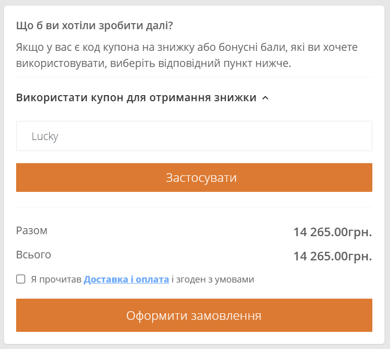Ми знаємо що у нас є код - Lucky, який дає 10% додаткову знижку. Вводимо його.