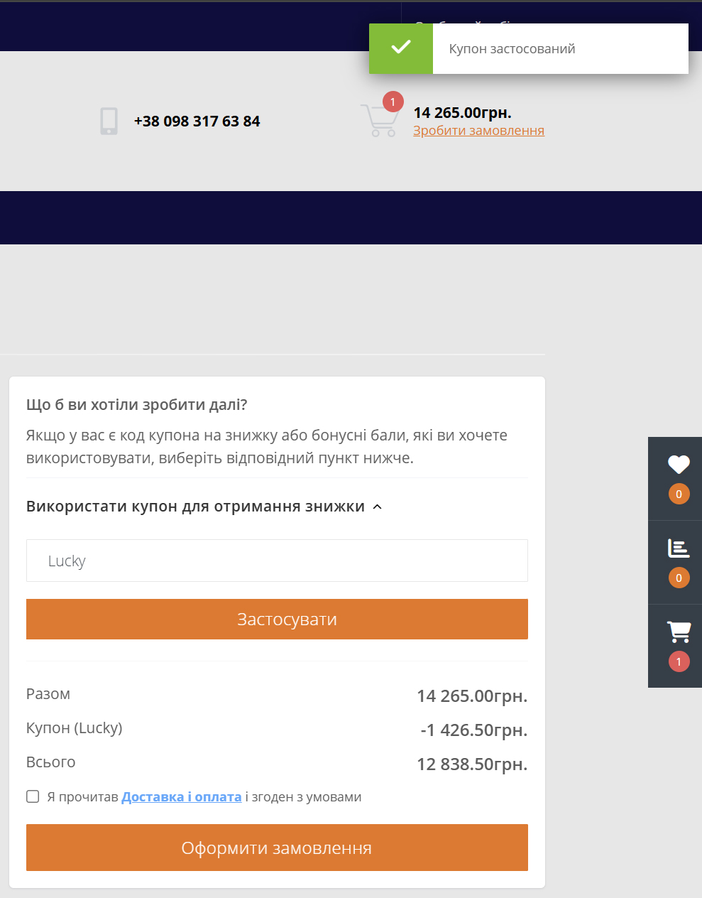Ви побачити, що з'явиться повідомлення - Купон застосований. Також ви побачити, що помінялась ціна Всього і була застосована знижка.