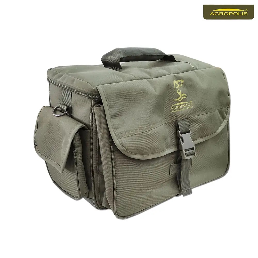 Сумка рибацька Acropolis РС-3н для спінінгіста. Основний матеріал стійкий до зносу та вологи - поліестер Oxford D600, підкладка з D75. Центральне відділеня з жорсткою мобільною перегородкою на липучці (застібка "Velcro"). Спеціальне місце під рибальську пластмасову коробку для снастей. По боках та спереду запасні відділення та кишені для рибацьких аксесуарів. В комплекті з сумкою іде зручний плечовий ремінь на металевих карабінах. На верхній кришці - ручка для транспортування. Закривається сумка на клапан з застібкою типу "тризуб". Хороший вибір сумки для активного відпочинку біля річки, озера чи в лісі.